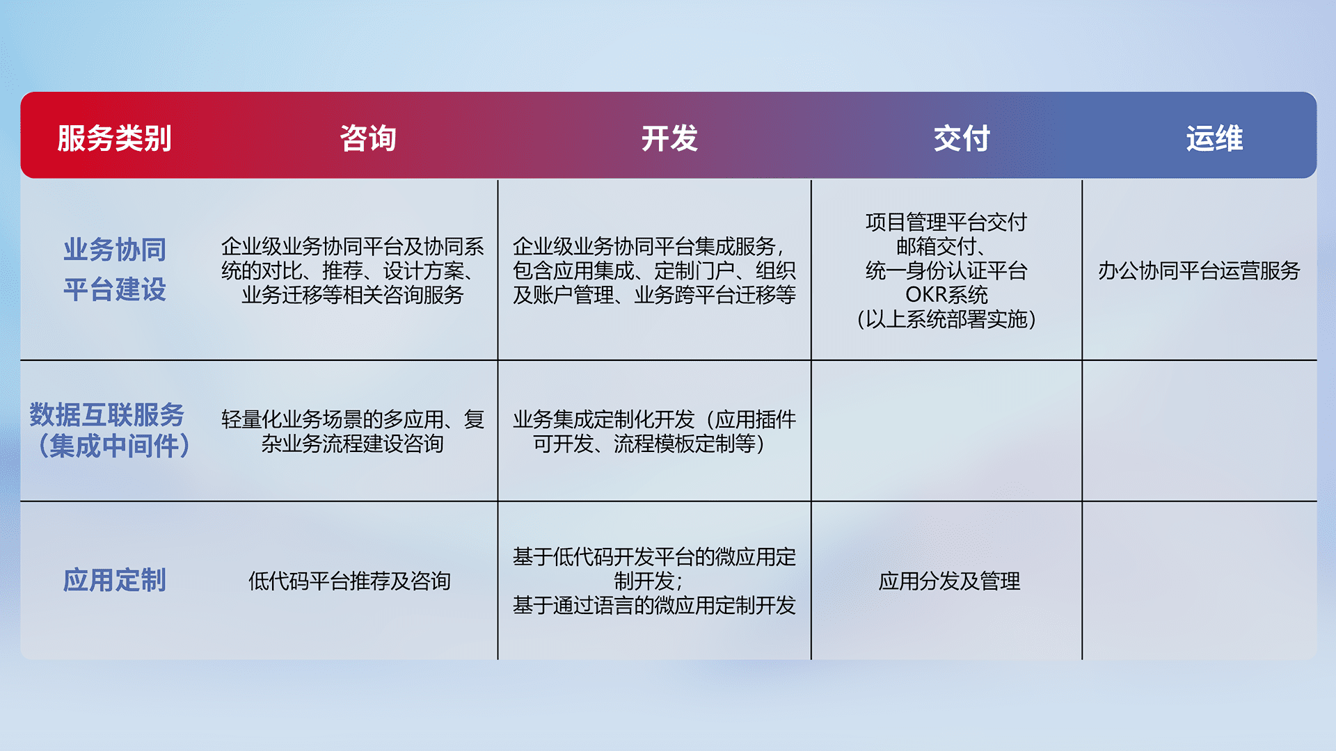 针对钉钉、、企微、、、、IDaas等平台级产品提供产品的规划、、方案、、、、交付、、、、定制化开发等服务,,,实现如统一协同办公、、智能客户服务、、混合会议管理、、、、智能数据查询、、、、等业务场景,,实现数字化转型。。