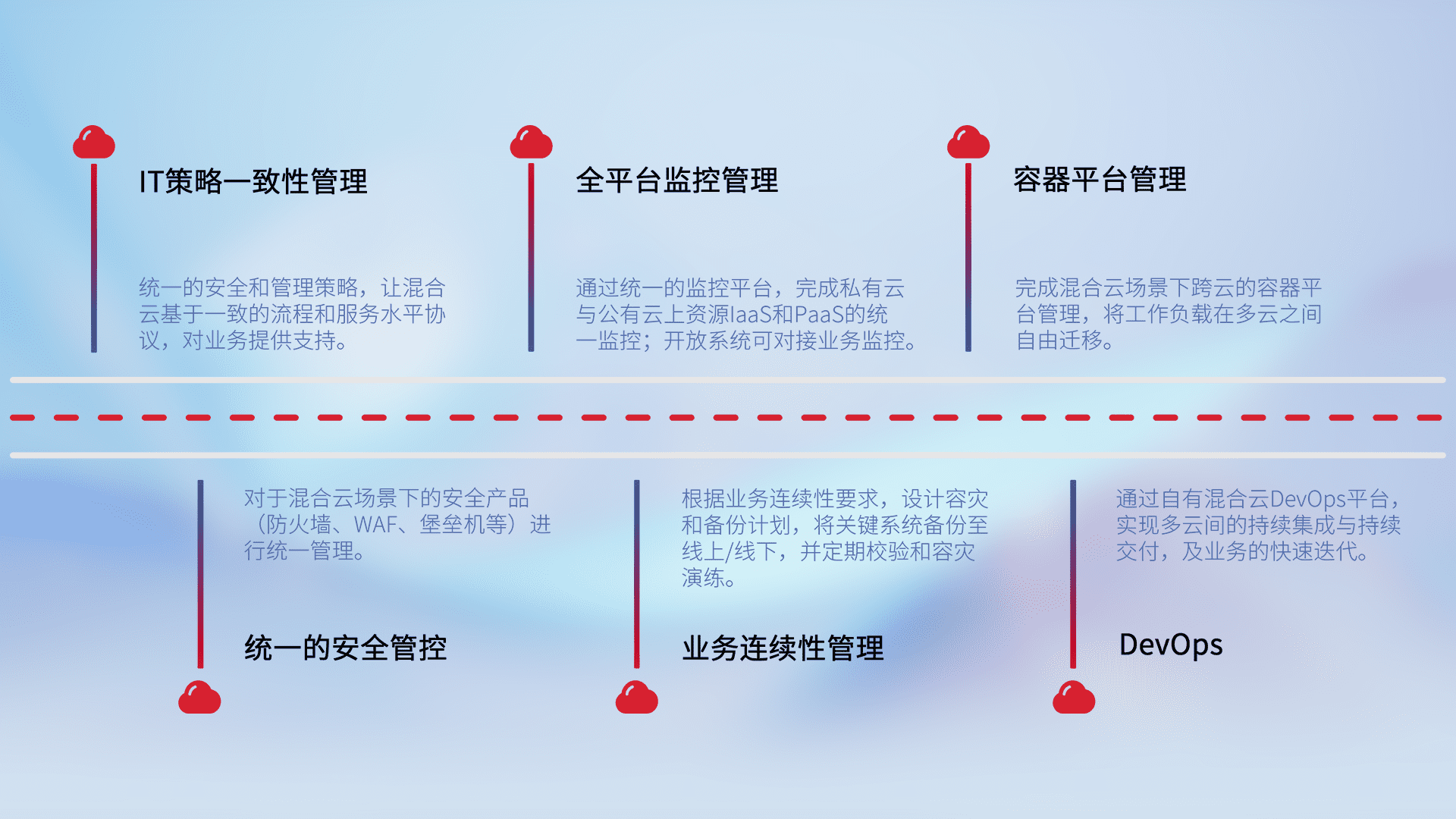 通过多云纳管,,以统一的资源数据模型把客户的云资源进行抽象和封装,,,,进而实现对多云资源的统一操作,,,保障云资源管理的可靠性、、、稳定性与可用性。。。量身定制化运维内容,,,配置、、、、开发运维、、、补丁管理、、、、备份、、监控、、、、认证和访问管理、、审计和日常巡检等,,保障在用云过程中的可靠度,,,稳定度以及高可用率。。